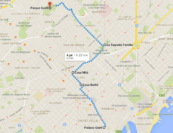 Em 1h30 de caminhada você conhece as principais obras de Gaudí, mas o roteiro também é acessível por transporte público